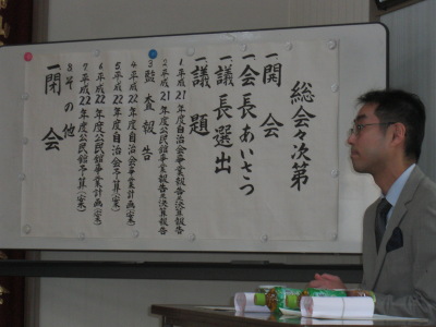 会長挨拶に始まり、六町内自治会と公民館それぞれの平成21年度の事業報告ならびに会計報告があり、さらに、平成22年度の事業計画と予算案の説明がありました。