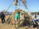 枯れ木や青竹で高く櫓(やぐら)を組み、櫓の下に茅(かや)や藁(わら)などの燃えやすいものを詰め込んだ「どんどや」に火を点けて、正月のお飾りを燃やし、鏡餅などを持ち寄って焼いて食べるものです。