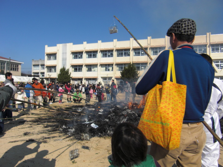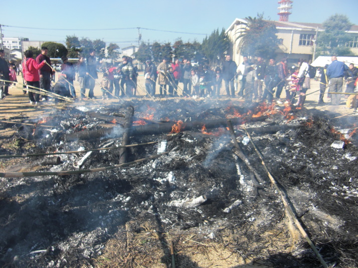 竹のパンパンはじける音を聞き、煙や灰をかぶることで、一年間の無病息災などを祈る、校長先生の挨拶でそのような事を言われていました。