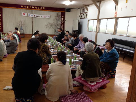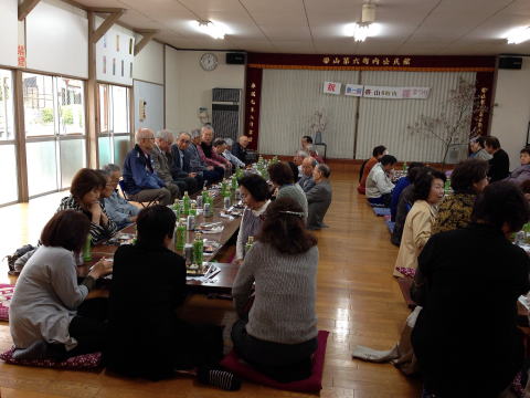 自治会、老人会、婦人会が中心となってご近所さんにも呼びかけられて、58人の方が参加され、公民館ホールでみんなでお弁当をいただきました。踊りやカラオケなどでにぎわいましたが、来年はぜひ桜の花の下で集いたいものです。