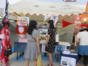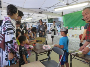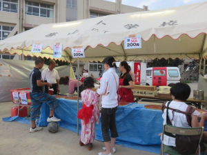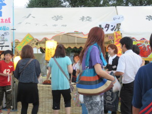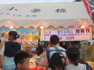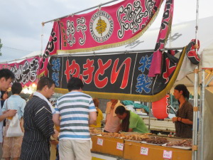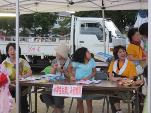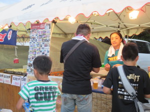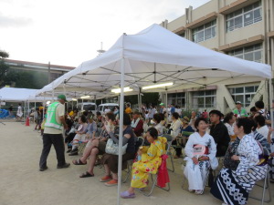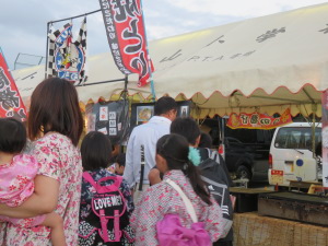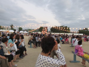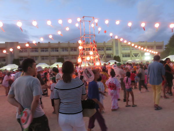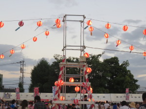 盆踊りの輪の中心に立つ櫓が今年は一段と高くそびえて、提灯がとても明るく広場を照らしていました。