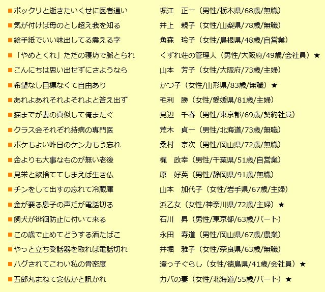 「第16回シルバー川柳」の入賞作品が9月8日発表されました。 全国有料老人ホーム協会が募集しているようです。 「そうだ、そうだ」と共感するものがたくさんありますね。ほっこりしたひとときでした。