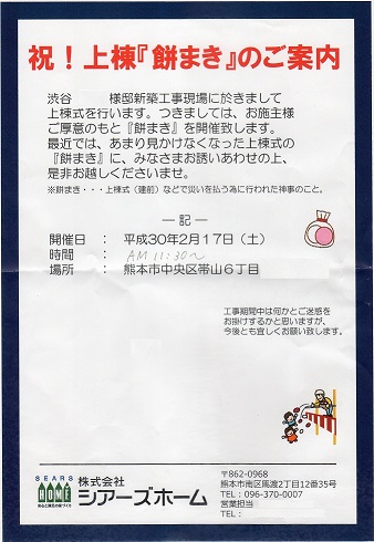今日17日土曜日、ご近所で上棟の「餅まき」がありました。