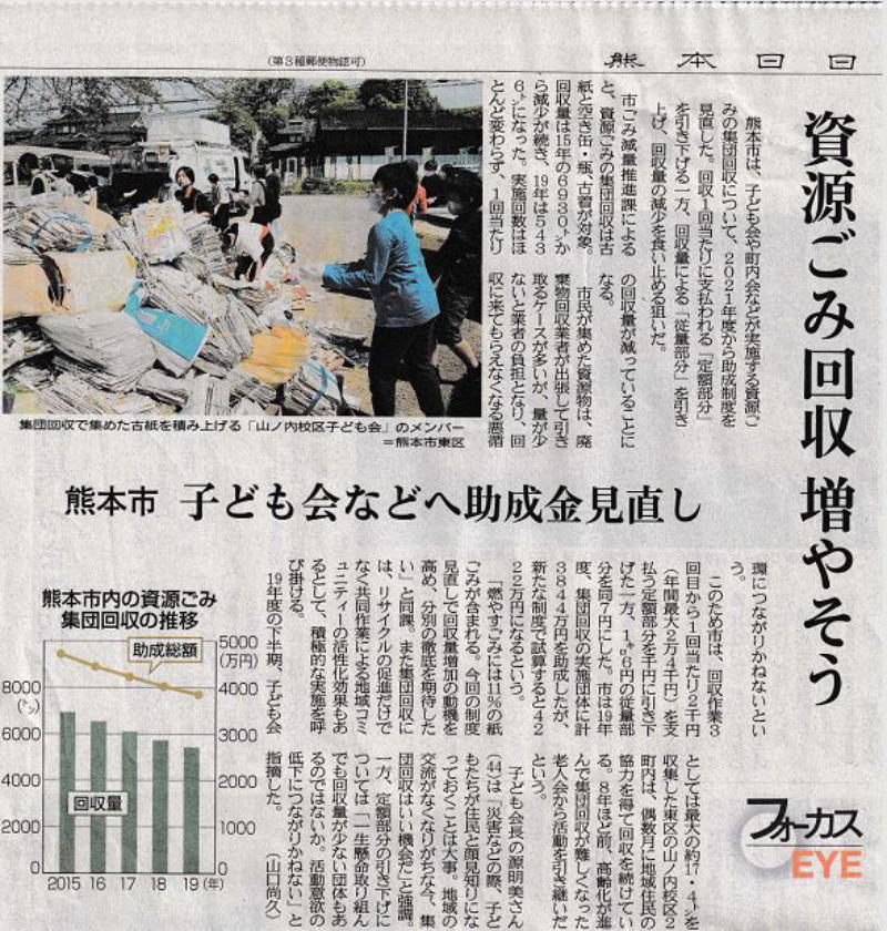 本日(4月21日(水))の熊本日日新聞・朝刊に資源ごみ回収についての記事が掲載されていました。
