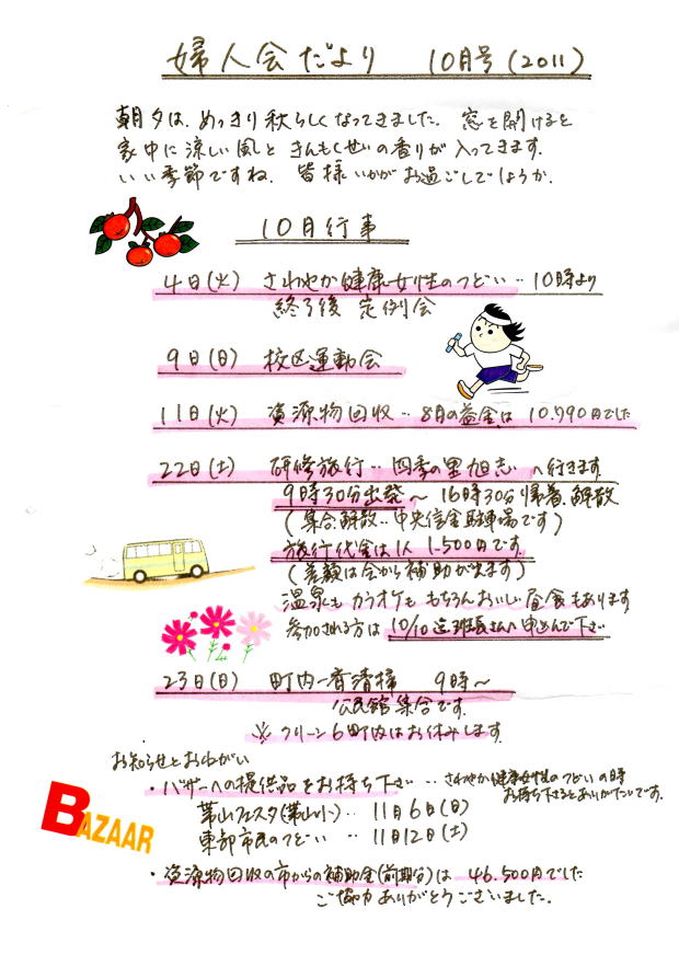 帯山6町内婦人会では毎月婦人会便りを発行しています。 かわいいイラストも入って、読んでいて楽しいので、ご了解をいただいて、婦人会員だけでなく校区の皆さんへも紹介することにしました。 資源物の回収も、婦人会の会員でない方からもご協力いただいていますので、その益金等もご参考になるかと思います。 これからも婦人会を応援してください