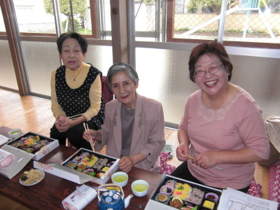 | 楽しい昼食団欒中の皆さんの写真を撮りましたが、ほとんどがピンボケでした。 カメラが悪いのか、腕が悪いのか、悲しい限りです。 折角笑顔を見せていただいた皆さん、すみませんでした。 次の機会は失敗しないよに致しますので、お許しください。 |