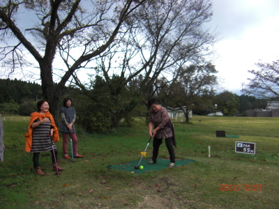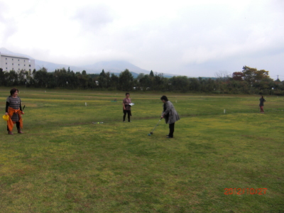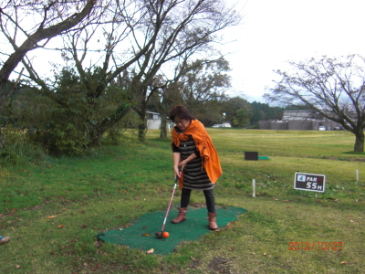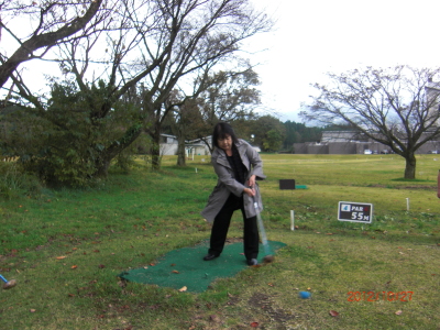 | 写真がうまく撮れませんでした。 バスの中は揺れてるし、食事は食べるのに一生懸命で 、カメラに気づいたときはもう全て食べ終わった後で した。おご馳走がたくさんあったのに・・・。 パークゴルフは5人で楽しみましたが、ご覧の通りの 名(迷?)ゴルファー揃い!、ラフに入って、なかな かグリーンに戻れなくても、ホールの周りを行ったり 来たりしながらも、めげません。笑いで吹き飛ばしま した。 雨が降りだして、結局最後までプレイできませんでし たが、スコアが残らなくてかえってラッキーだったか も。 次の機会は、頑張るぞ!! |