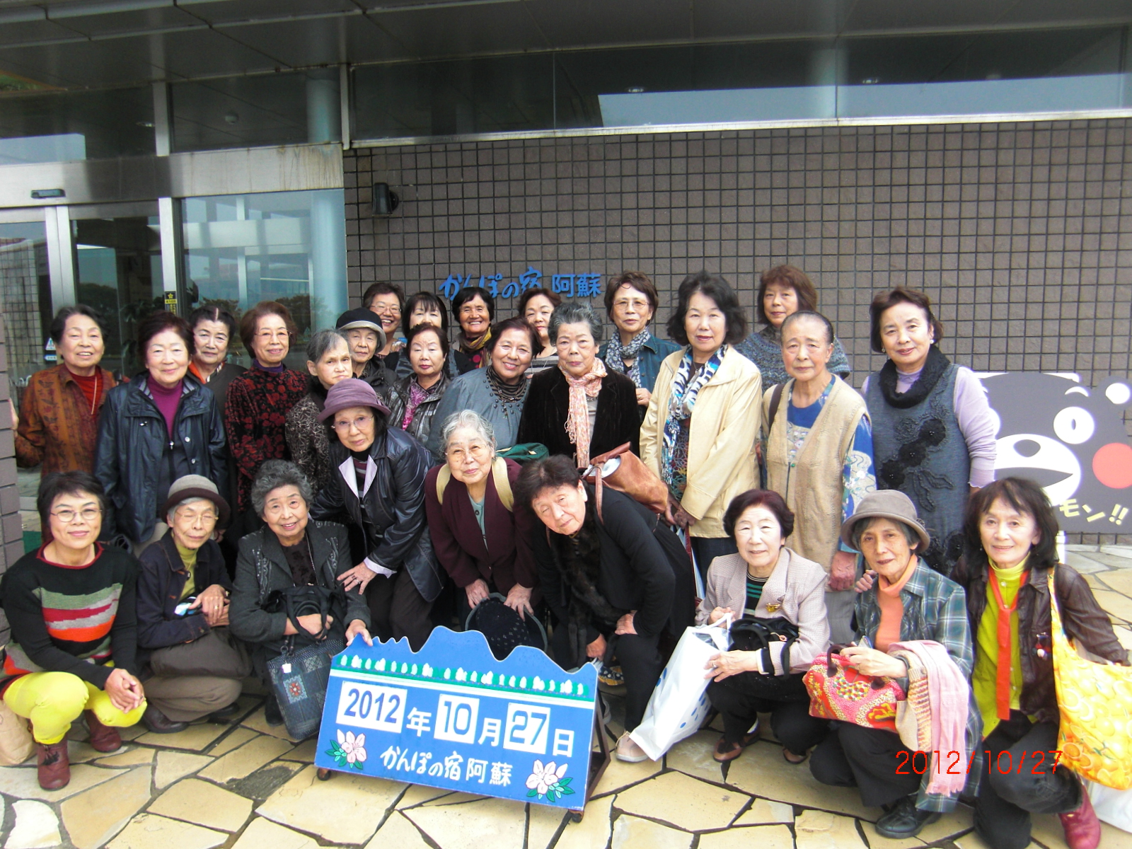 この日の参加者は27名。目指すはかんぽの宿・阿蘇。私たち熊本県人の自慢の観光地で、もう何回も行っている場所ですが、こうしてみんなでわいわいとバスでご一緒するのもいいものです。