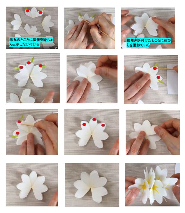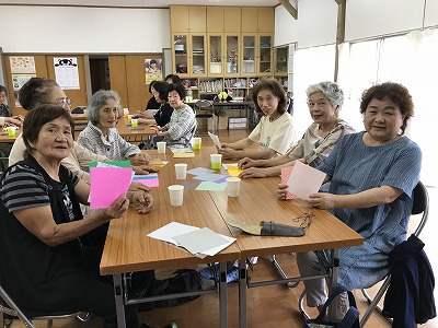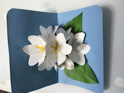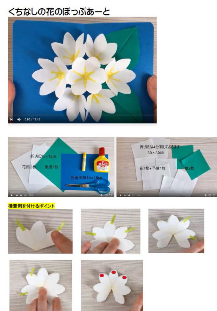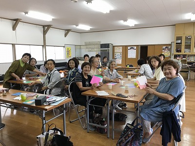 後半残り少ない時間で、くちなしの花のポップアートもちょっと学習しました。詳しい作り方は次回の婦人会便りに添付して皆様に配布してくださるという事ですので、今回出席できなかった会員の皆さんも挑戦してみてくださいね。