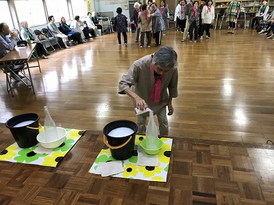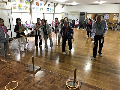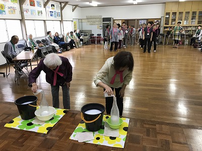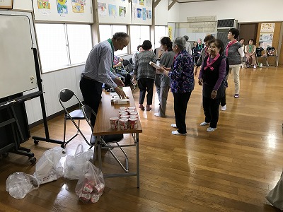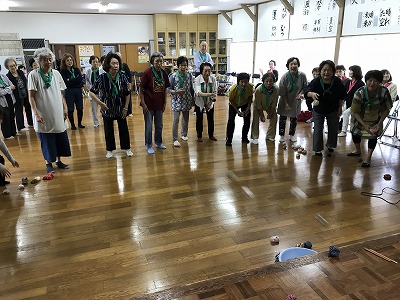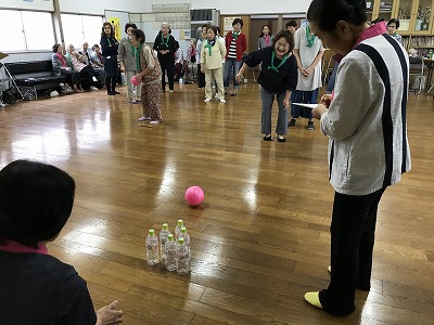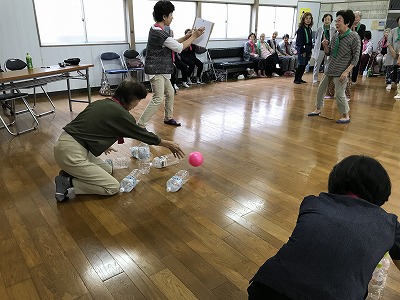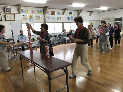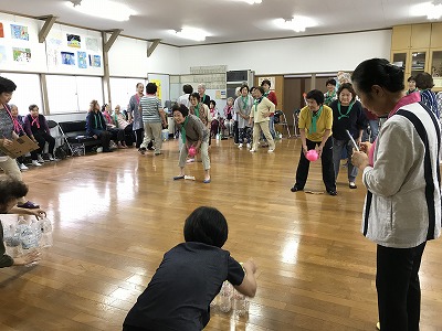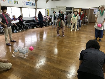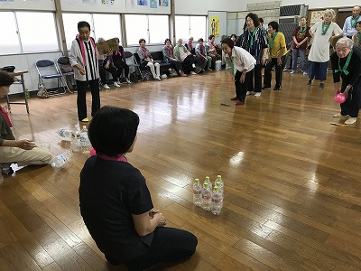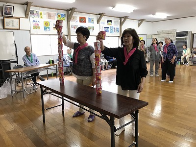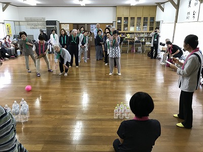競技種目は後日行われる校区の体育祭でも競われる、防災訓練や輪投げに加え、ボーリングに見立てた瓶倒し、そして婦人会長さんの新しいアイデアで、玉入れとカップの積み上げゲームがありました。