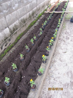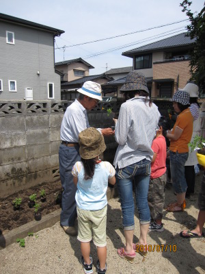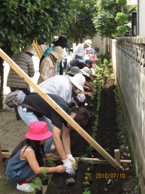 参加した子供たちはみんな目を輝かせて、町内会長さんの説明を熱心に聞き、お父さん、お母さんと一緒にマリーゴールドを植えました。