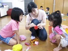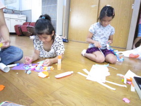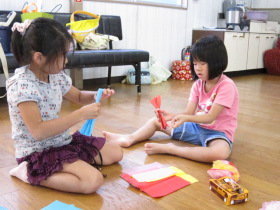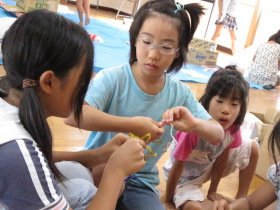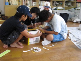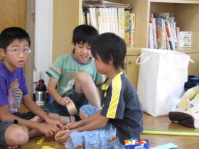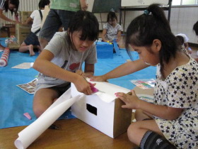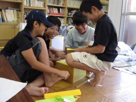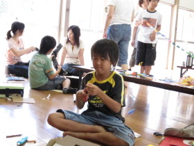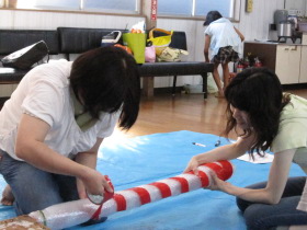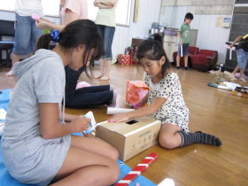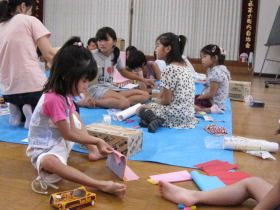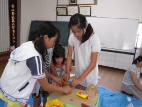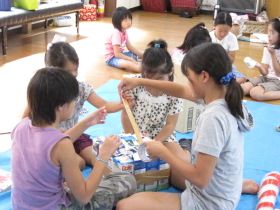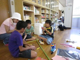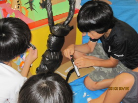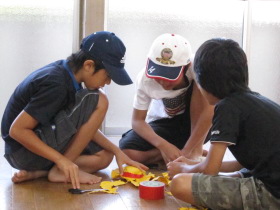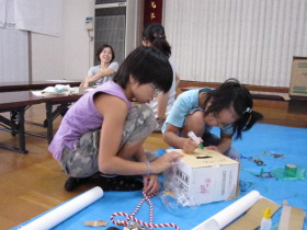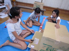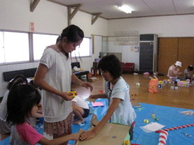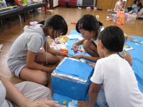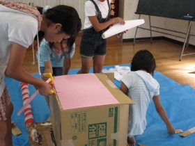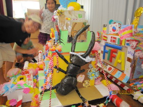 8月24日はみんなが楽しみにしている「地蔵祭り」です。 A班、B班に分かれて毎年神輿を手作りします。 8月8日(日)、この日はA班の子供会で神輿作りをしました。 22名が集まり、みんなでアイディアを出し合って、協力して取り組みました。 テーマは「夏」。 大きなクワガタがひときわ目立っていましたね。 花火や麦わら帽子の飾りなどで華やかな神輿が出来上がりました。 一日がかり!、みんなよく頑張ったね。 本番が楽しみです。