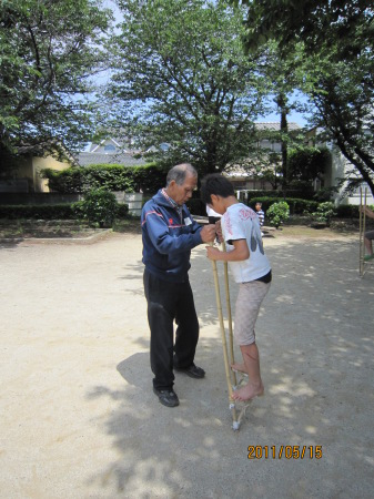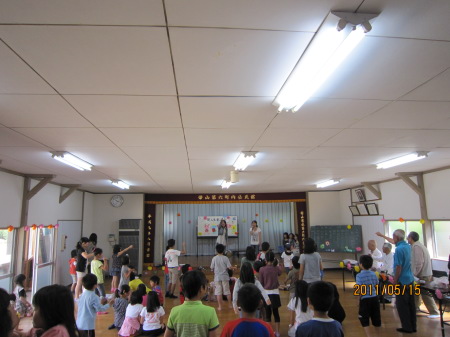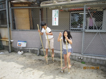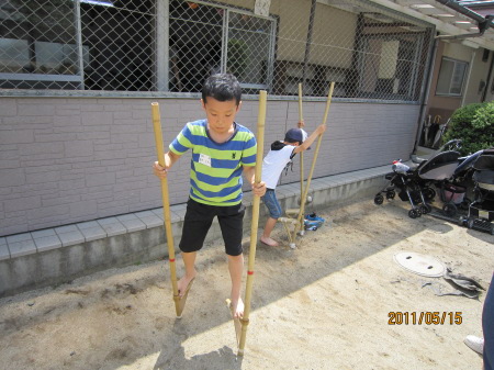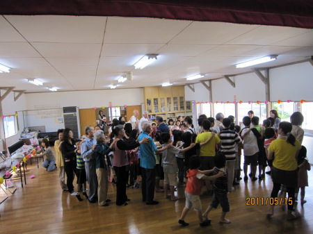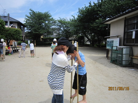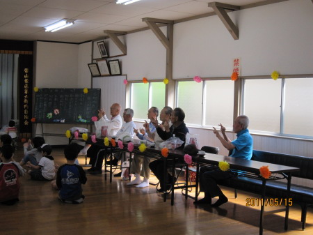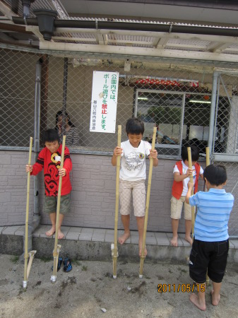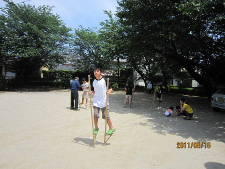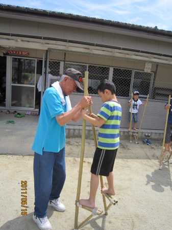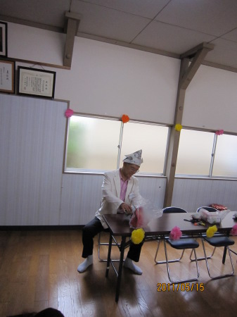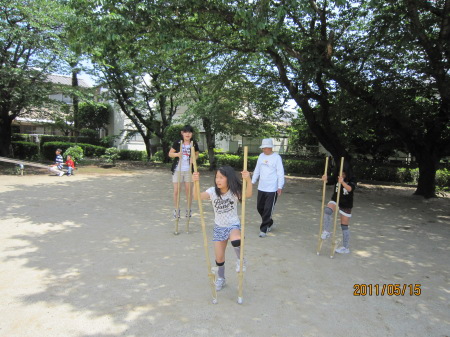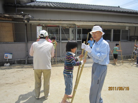 お楽しみ会では、ジャンケンゲーム、帯山音頭の踊りのお稽古で盛り上がり、そのあとは町内の老人会、婦人会から応援に来ていただいて、部屋の中では、お手玉、折り紙、あやとり、かぶと作り、広場では竹馬、