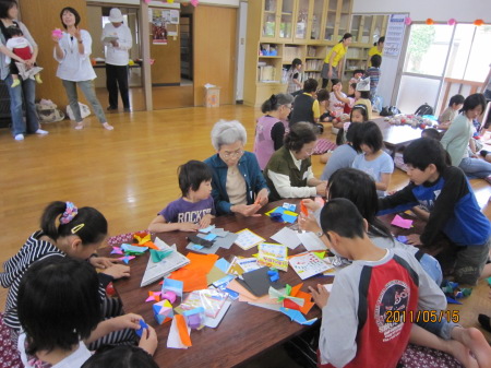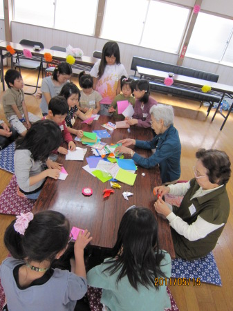 自治会、老人会、婦人会から12名もの方々に応援をいただき、伝承遊び、お手玉、折り紙などわくわくしながら教えてもらいました。