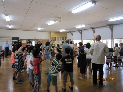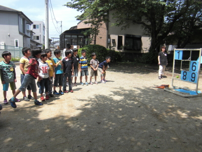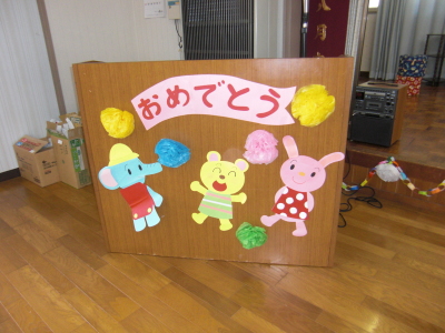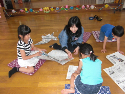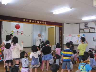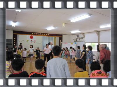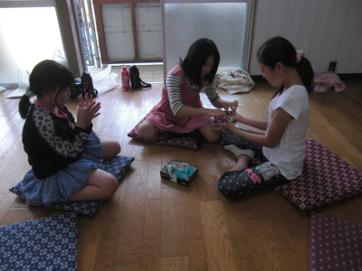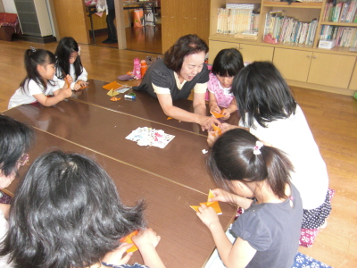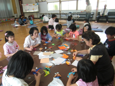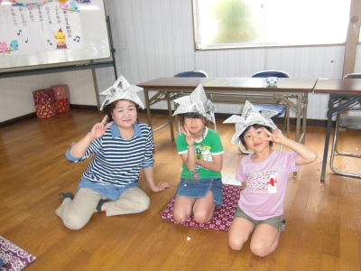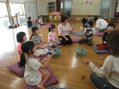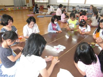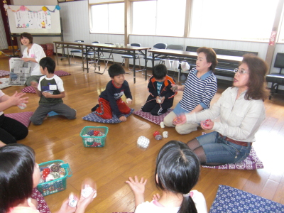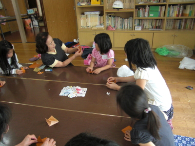 お楽しみ会では、ジャンケンゲーム、帯山音頭の踊りのお稽古で盛り上がり、そのあとは町内の老人会、婦人会から応援に来ていただいて、部屋の中では、お手玉、折り紙、あやとり、かぶと作り等、広場では竹馬、ボールを数字のボードに当てるストライクアウトゲーム等を指導してもらいました。