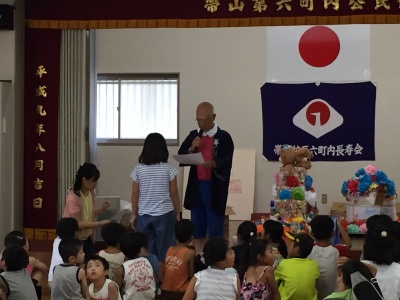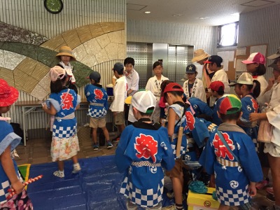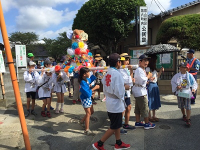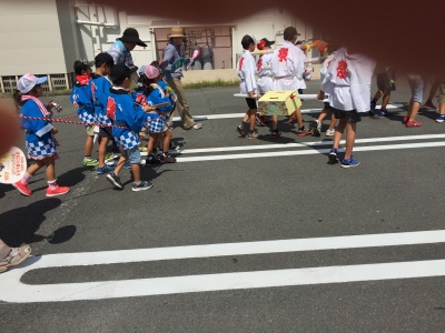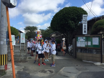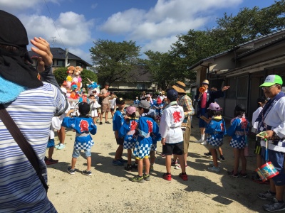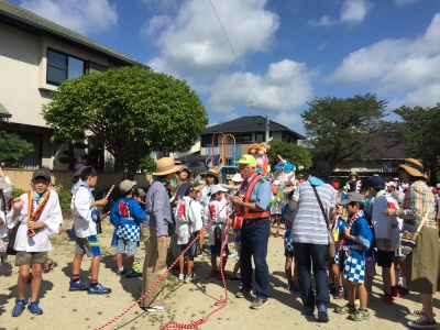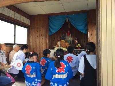 朝8時半、地蔵堂に子供会の代表と自治会の役員さん達が集まり、9時から広徳寺のご住職さんの読経が始まりました。空は真っ青、法被姿の子どもたちの顔にはもう汗が滴れ落ちていました。