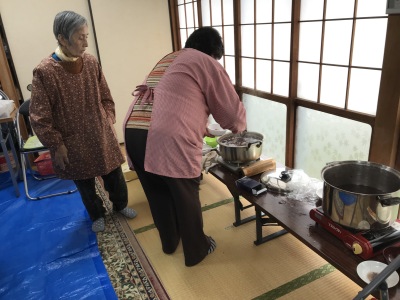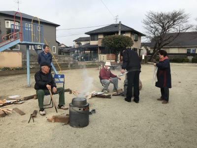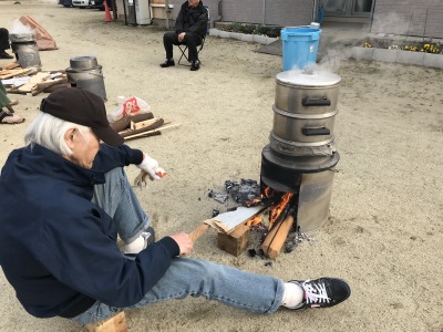 何といっても今日は6年生の卒業を祝う催し、自治会の役員の方々は前日からいろいろと準備して、今朝は8時前から3個のかまどに火がつけられていました。