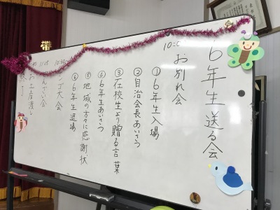10時から本番の6年生を送る会が始まり、6年生が花道から入場、自治会長からのお祝いの言葉、在校生からの贈る言葉、記念品贈呈、そして6年生から6年間の思い出に残った事などとこれからの抱負などの挨拶がありました。