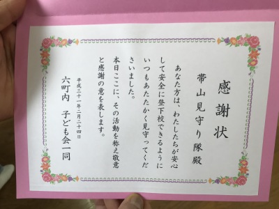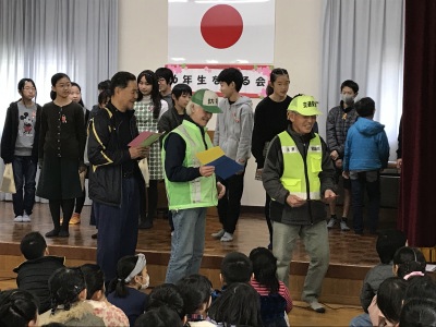 その後、日ごろ登下校時の見守りや交通指導をしてくださっている地域のパトロール隊の方々に感謝状が贈られました。