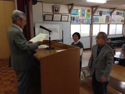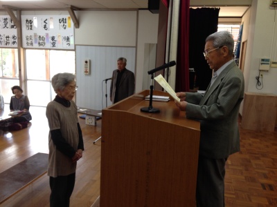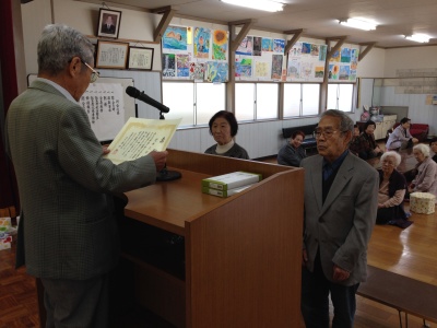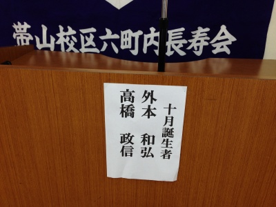 平成25年10月30日、毎月恒例の帯山6町内長寿会が開催されました。 今月誕生をお迎えになられた方は2名、9月に比べると少なかったですね。 この日は、先に熊本市において白寿、米寿、傘寿の表彰式があり、わが町内から米寿と傘寿の受賞者に 会長から表彰状が手渡されました。 受賞された方は次の方々でした 米寿(88歳) 荒木 三守さん 久保 和子さん 傘寿(80歳) 塚本恵美子さん