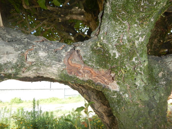 ここに、穿孔性(せんこうせい)昆虫の樹皮下昆虫(キクイムシ類、ゾウムシ類)がつき、抵抗力のないキンモクセイの内樹皮(師部)を食害し、水や栄養の通道障害を起こして枯死に至ったものと推察されます。』樹木医:伊東麗子氏