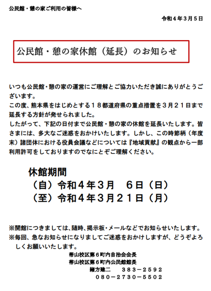 | 02/03/29 | 公民館休館延長のお知らせ |