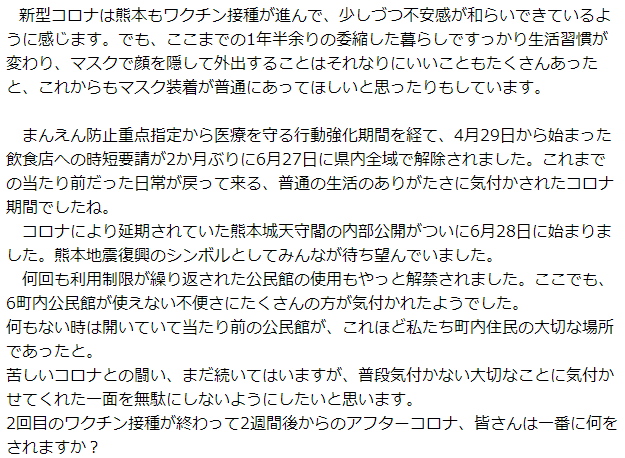 4月に新型コロナ接種券が65歳以上の高齢者に送付され、5月6日から初回の予約受付が開始されました。 受付当日までは電話やネット予約がどれくらい輻輳するのか予想ができなかったので、まあ、初回で取れなくてもその次がある、と安心していましたら、何と次は年齢制限がかかって年齢に達してない人は申し込みができなくなりました。 そこまでは仕方ないと次を待っていましたが、その後数日間はなんのアナウンスもなく、混乱で機能がストップしてしまったのではと、とても不安になりました。 結局26日に70歳以上の予約スケジュールが発表されましたが、ふり返って見ればほんの数日間の遅れだったにも拘わらず、当初のスケジュール通り運ばなかったことは待つ身にとってはとても酷な時間でした。 全国統一の予約方法だったのでしょうが、高齢者優先・高齢者優遇のはずが、高齢者のほとんどが自分では予約しにくい、全く高齢者に優しくない・思いやりのない方法であったように思います。 そのような中で、29日受付分から始まったサポートセンターの設置はとても良かった。 帯山校区でもコミセンと我が6町内公民館でサポート窓口が急遽設けられ、6町内公民館でも29日と30日2日間で60名程度のオンライン予約をお手伝いすることができたようです。 熊本市の職員さんが待機され、民生委員さん、自治会役員の方々、が感染対策に注意を払いながらお手伝いされていました。気が重かったコロナワクチン予約期間でしたが、この2日間で少し楽になりました。 まだまだ予断を許さないコロナ禍の中、初めて遭遇する環境の中でみんながおろおろなるのも仕方ないことなので、気を落ち着けて時を待ちたいと思います。それにしても5月の熊本県の爆発的感染拡大は恐怖でしたね。合わせて梅雨入りも今年は早かった、とにかく例年より気が抜けない6月のスタートです。 |