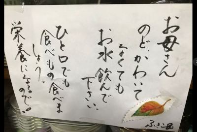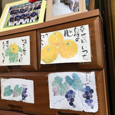 うーん、長生きの秘訣、なんとなくわかるような気がしました。アクセサリー、化粧、おしゃれ心を失わないこと。私落第だなあ。大分頑張らなきゃ、今のままじゃ長生きなんて到底無理だわ。良い勉強になります。 お部屋にはご家族の方からのメッセージや絵手紙がたくさん掲出してありました。