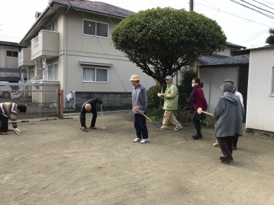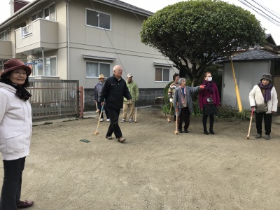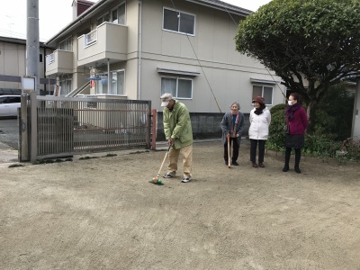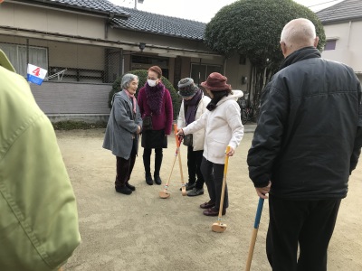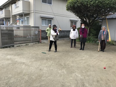 長寿会例会では毎月、その月の誕生者を祝い、ちょっとしたレクリエーションを行っていますが、いつも輪投げ等の室内ゲームだけで、外で行うゲームは何か無いものかと考えられていました。