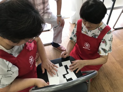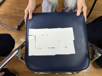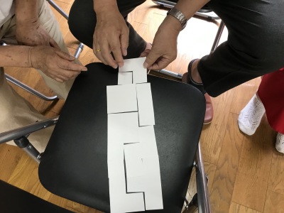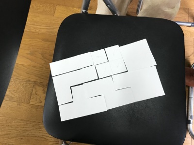 ばらばらで袋に入った8片の厚紙をつなぎ合わせて長方形を作る、というパズルでしたが、3人