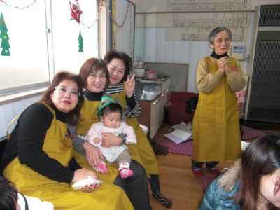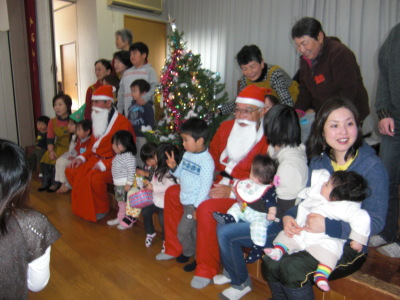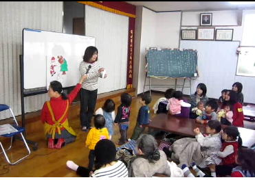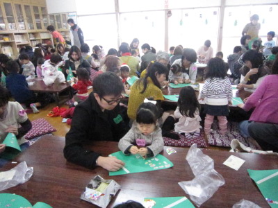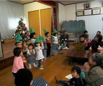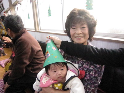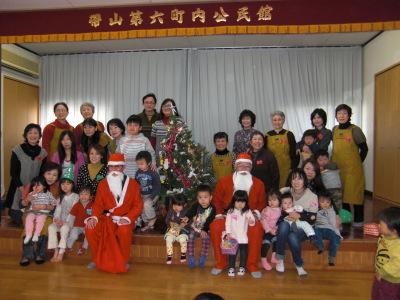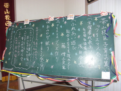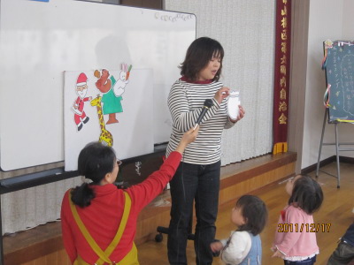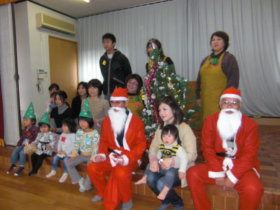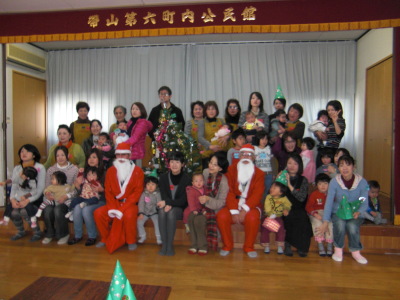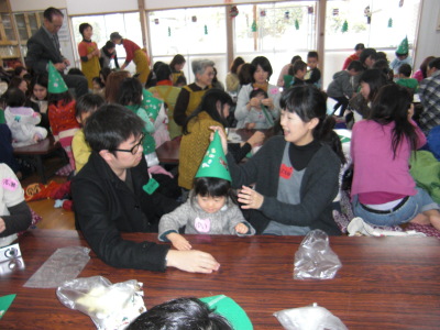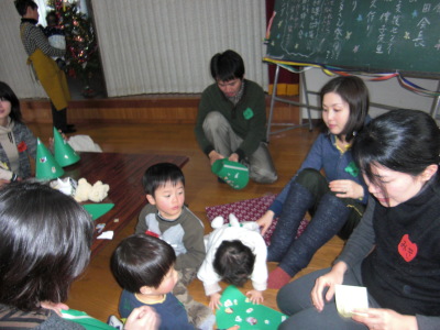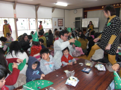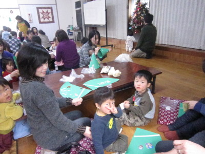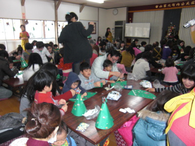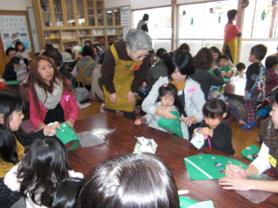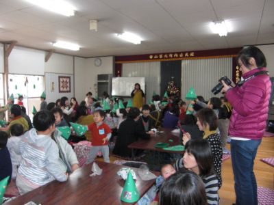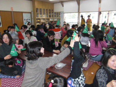帯山校区で元気に育つ3歳までの幼児とそのお父さん、お母さん方を招いて、楽しいお話やクリスマスのとんがり帽子を作って楽しみました。