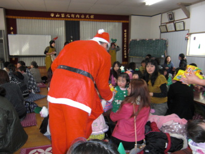 今年もジングルベルなどクリスマスの楽しい音楽にあわせて、遠くからソリに乗ってサンタさんがやってきてくれましたよ。もちろんプレゼントがどっさり詰まった大きな袋を肩に担いで。