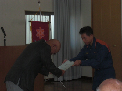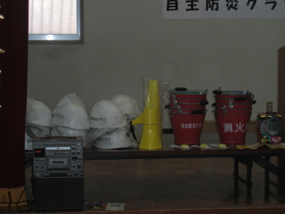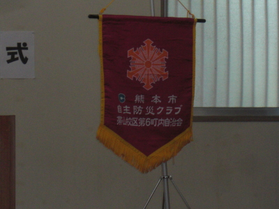 そのあと、資機材(標旗、ヘルメット、バケツ、メガホン等)の贈呈が行われました。立派な旗でしたよ。