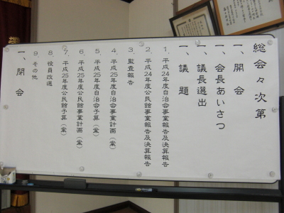 総会の議事内容は24年度の、自治会と公民館の事業報告と決算報告、監査報告、25年度の自治会と公民館の事業計画と予算について説明がありました。