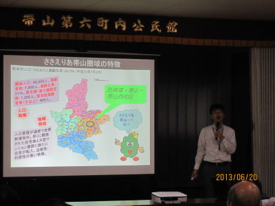 この日は私たちの地域を担当してくださる「熊本市高齢者支援センターささえりあ帯山」から専門スタッフの方においでいただき、帯山地域の特徴や「ささえりあ」の利活用についての説明がありました。