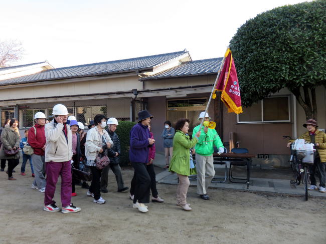 わが6町内は朝8時15分までに公民館広場に集まり、8時30分に避難場所の帯山小学校へ向けて隊列を組んで歩きました。子供会からも大勢参加されていて、6町内からは当初の予定の50人を大幅に上回り、70名ほどの参加でした。
