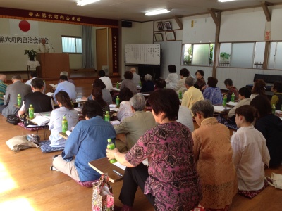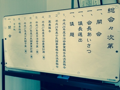 総会の議事内容は26年度の、自治会と公民館の事業報告と決算報告、監査報告、27年度の自治会と公民館の事業計画と予算について説明がありました。