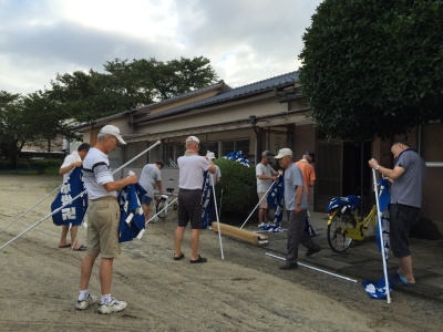旗を竿に通して組み立てが終わったらそれぞれの役員さんは、一人3~4本くらいづつ持って町内の要所に設置に