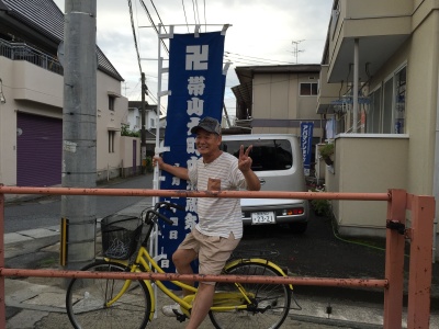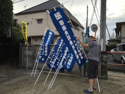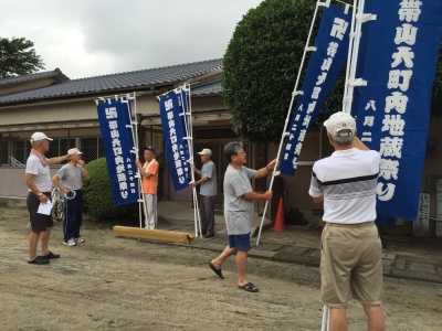 8月13日(木)、その地蔵祭りに先だって、案内の旗を町内の要所要所に設置するべく、朝早くから役員の方々は