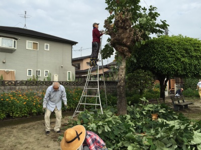 老人会、婦人会の皆さんが朝早くからまちの広場の木の剪定と草取りをしてくださいました。