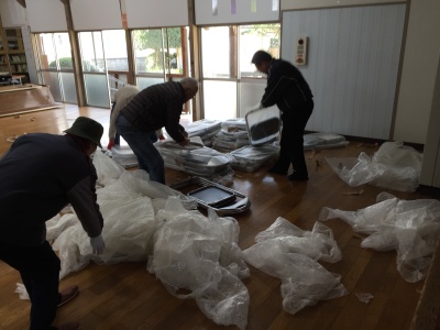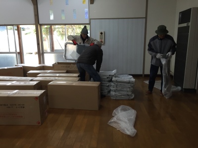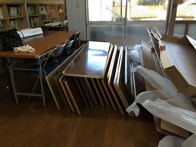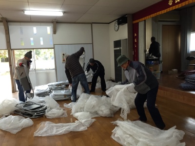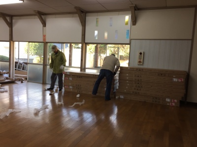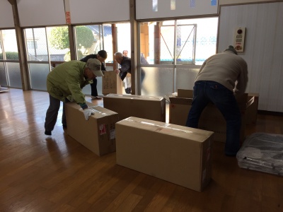 平成27年12月16日と17日の2日間にかけてテーブル30組、椅子90脚が公民館に搬入され、理事の方々が梱包を解く