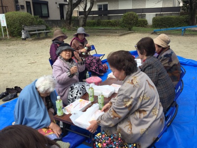 でも、お弁当を少しいただいたくらいから小雨模様になり、とうとう公民館ホールに大移動、ちょっと大変なお花見に