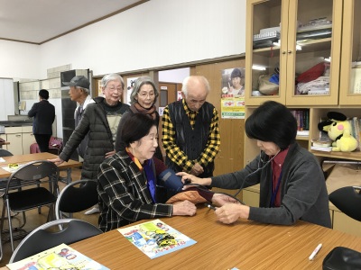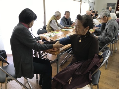 社会福祉協議会から久富会長さんに主催者のごあいさつをいただき、とうや病院さんには参加された皆さんの血圧測定など、健康相談に応じていただきました。