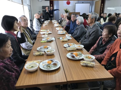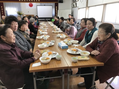 最後はお楽しみの昼食会、今年も民生委員さん方の手作りでたくさんのおごちそうが振舞われました。特に団子汁は毎年大好評です。