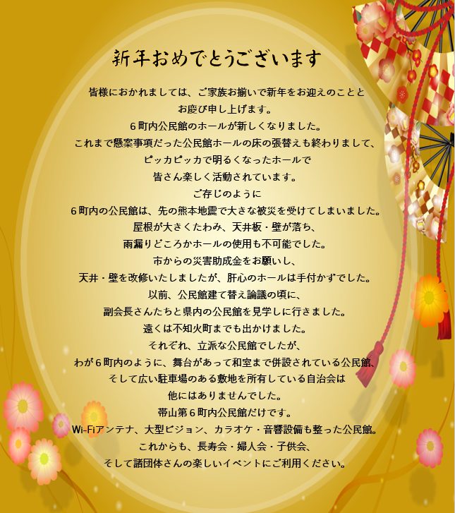 新年おめでとうございます 2025.12.31 帯山第6町内自治会長 緒方 建二 新着記事 「月曜から早起き」2026年1月26日号 2026.01.26 六郎さんの脳トレクイズ-95(おびろくさんち) 2026.01.26 「月曜から早起き」2026年1月19日号 2026.01.19 六郎さんの脳トレクイズ-94(おびろくさんち) 2026.01.19 「月曜から早起き」2026年1月12日号 2026.01.12 会長特急便 地蔵堂のお賽銭箱が無くなっている!(会長特急便) 2025.07.03 帯山小学校の卒業式に参列しました(会長特急便) 2025.03.22 2024年・自治会7大ニュース(会長特急便) 2024.12.302024.12.31 5丁目公園の除草作業(会長特急便) 2024.11.11 五丁目公園の3回除草作業を9月8日に実施しました(会長特急便) 2024.09.102024.10.20 もっと見る 帯山第6町内のにぎわいと自治会活動に協賛されている団体様ご案内マップ