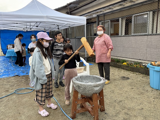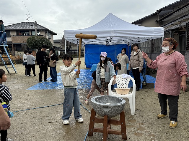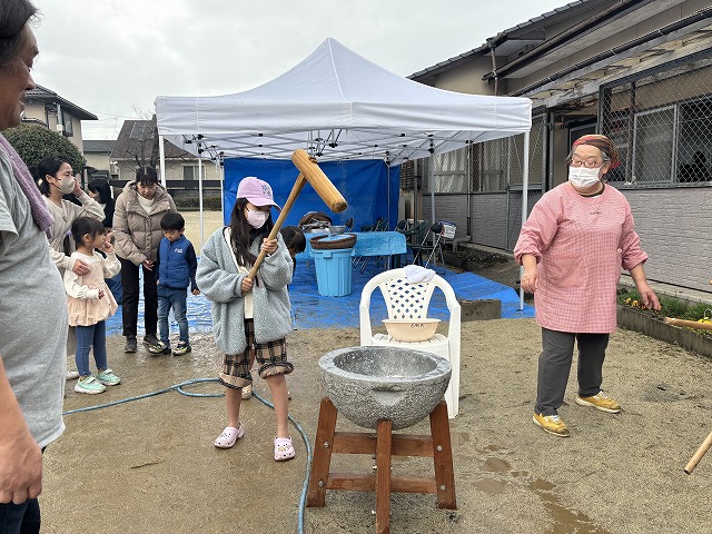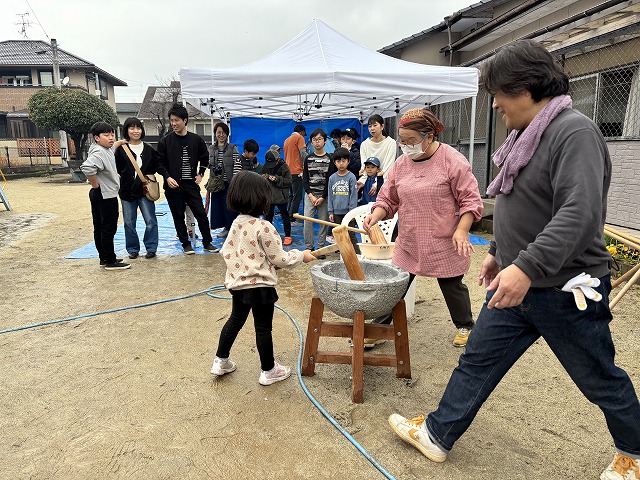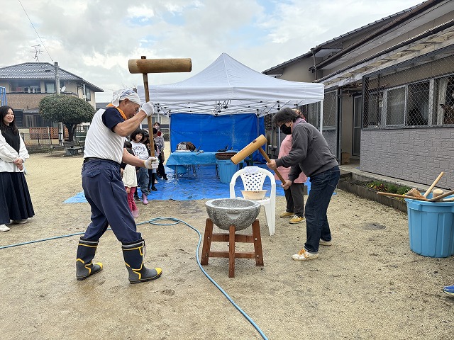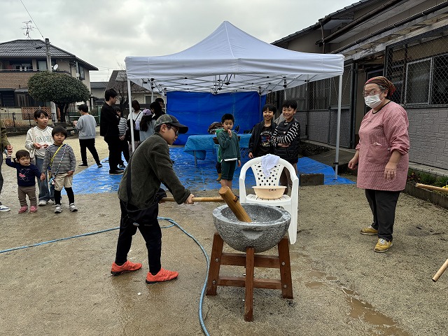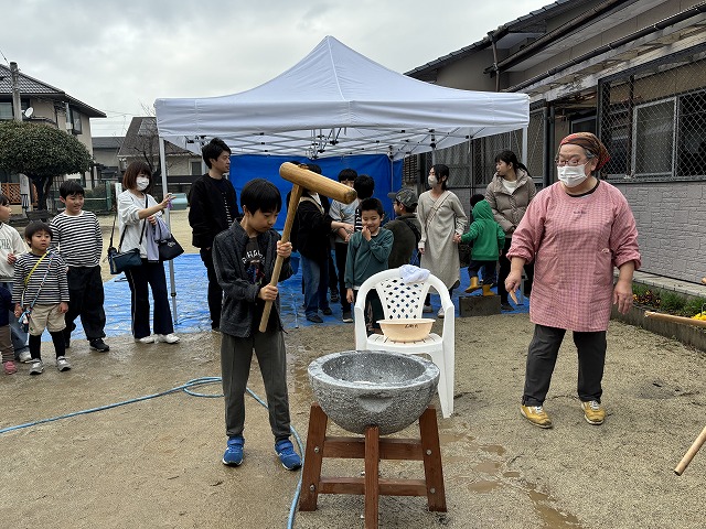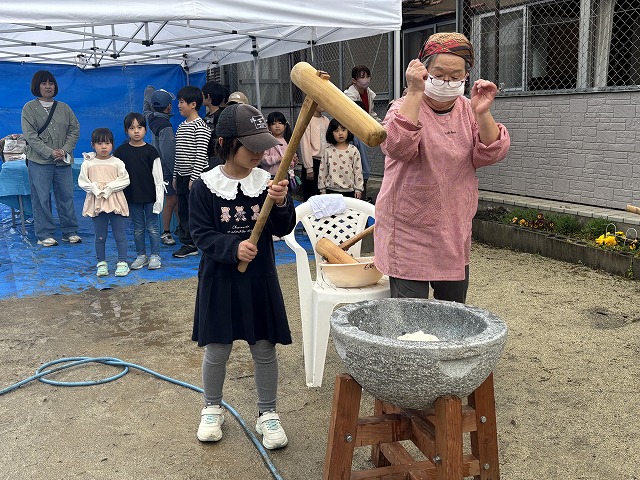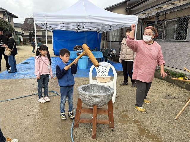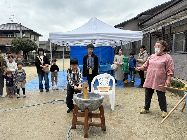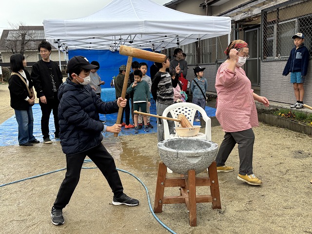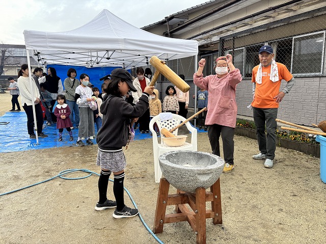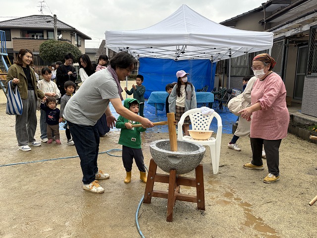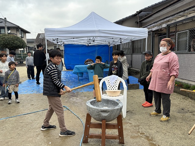 たくさんのお友達が、重い杵を担ぎ石臼に振り下ろした体験は、ここでしかできない貴重な思い出としていつまでも記憶に残ることでしょう。