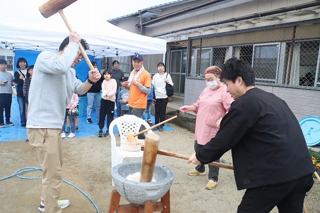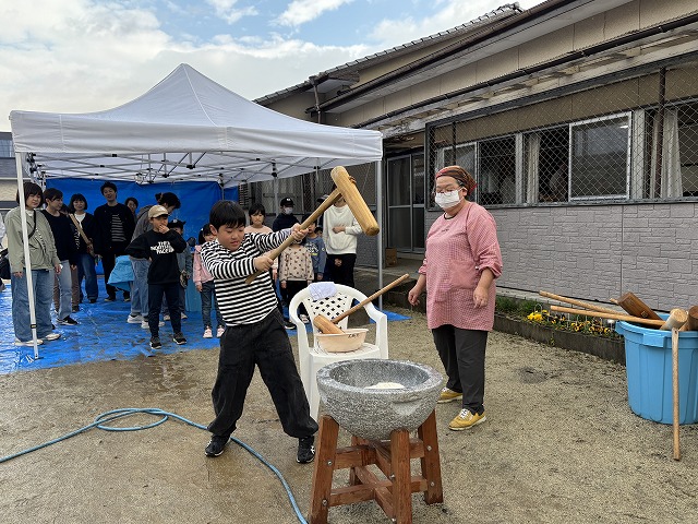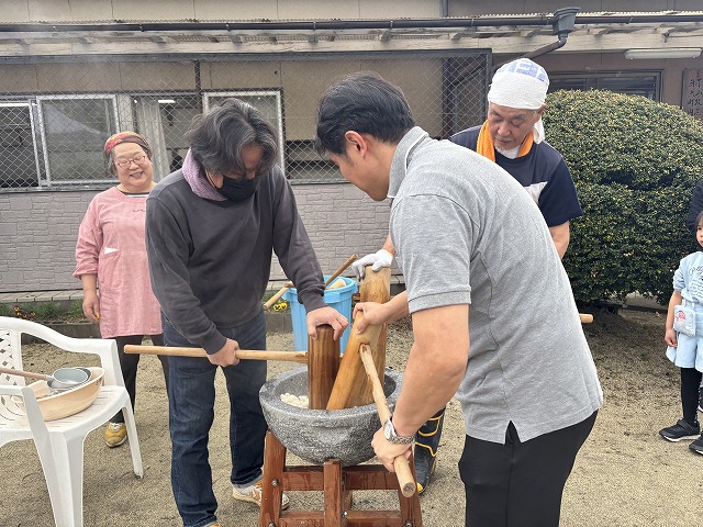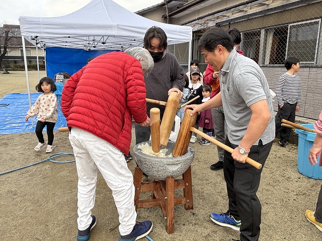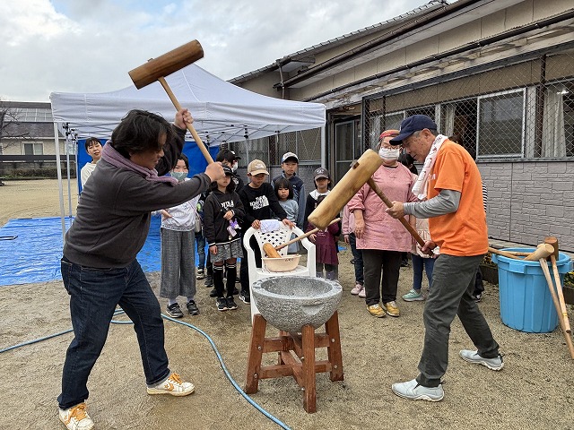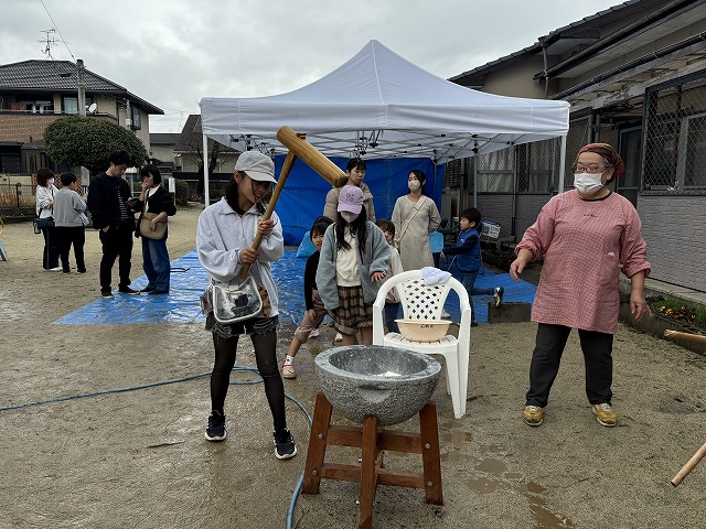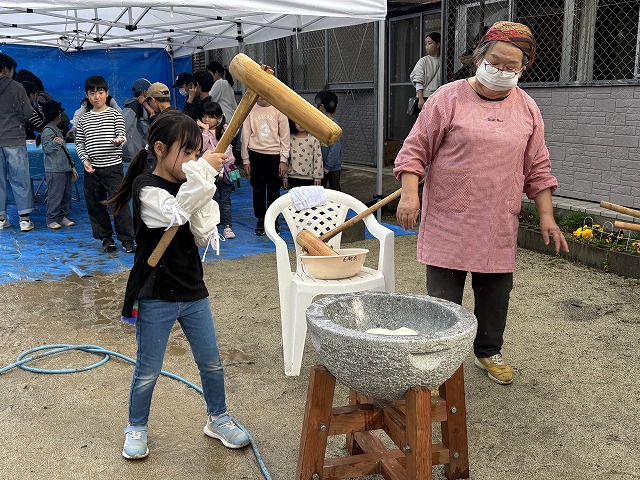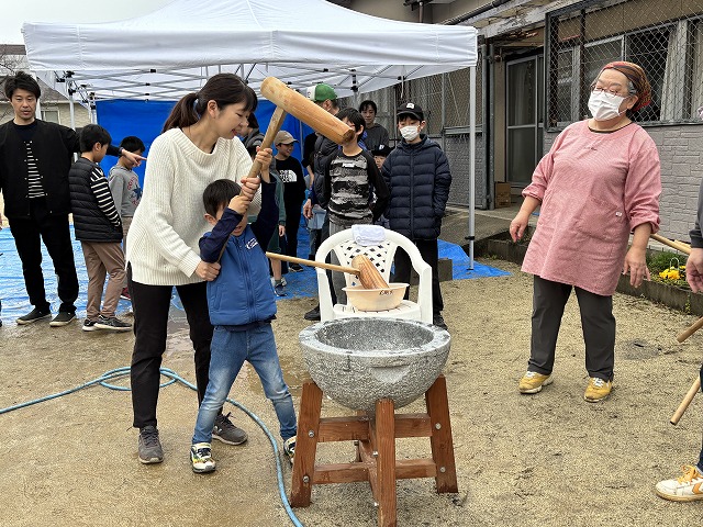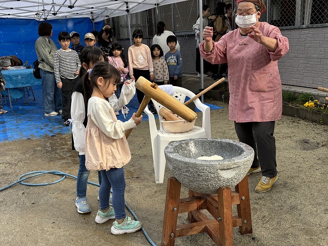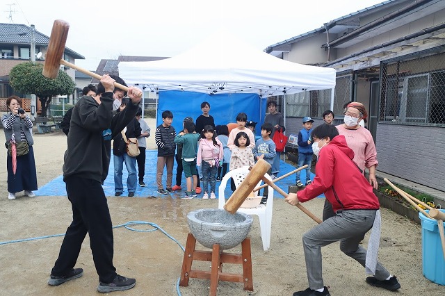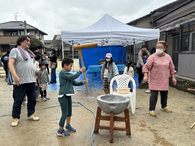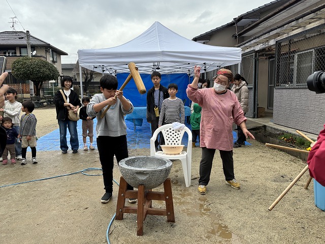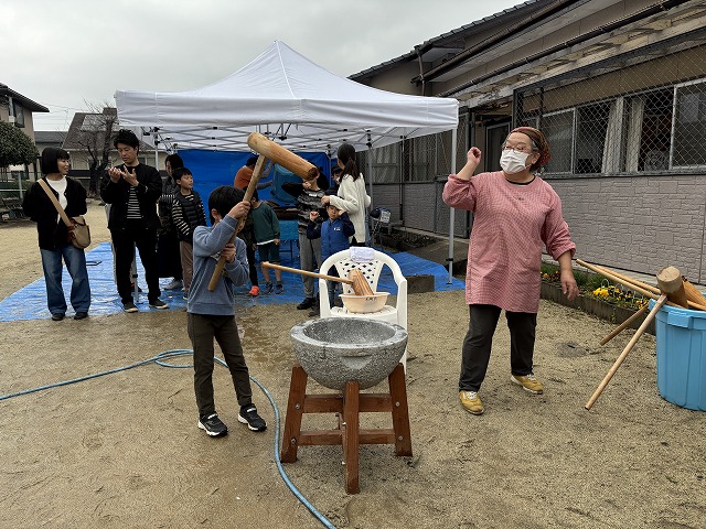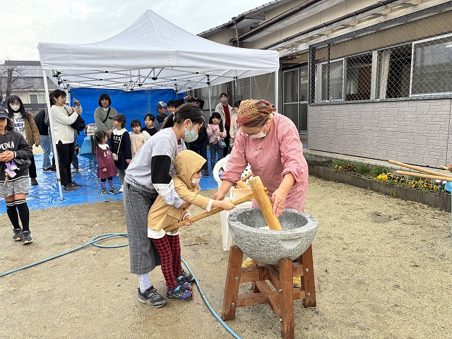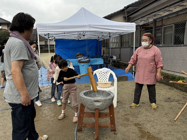 たくさんのお友達が、重い杵を担ぎ石臼に振り下ろした体験は、ここでしかできない貴重な思い出としていつまでも記憶に残ることでしょう。