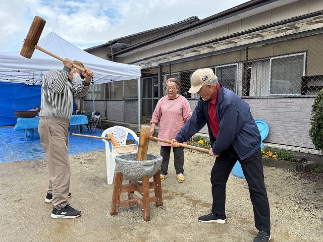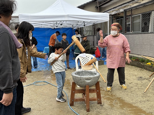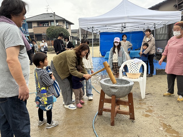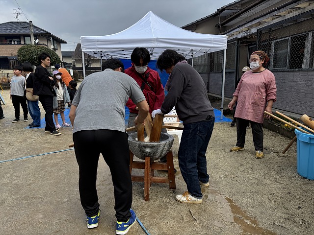 前日の夜から雨模様、午前8時からの準備時には雨は上がったものの、雨上がりの緩んだ地面で餅つきができるのか心配しましたが、その不安を吹き飛ばすかのようにたくさんのお友達が集まって無事に餅つき体験ができました。
