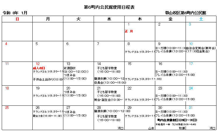 令和8年1月公民館使用予定表